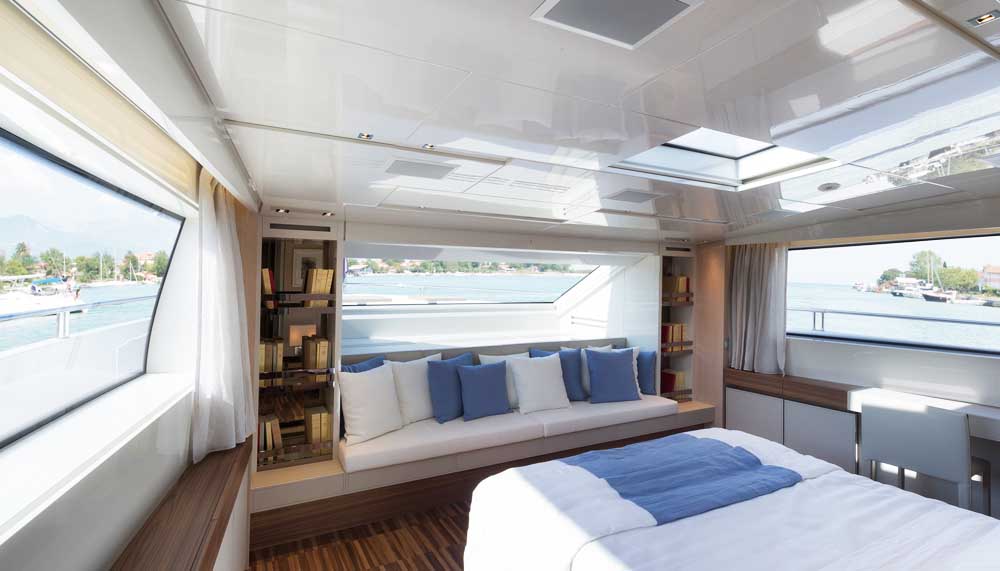 The idea of yachts serving as modern-day chateaus led to the creation of the SL106, one of which berthed recently at the Royal Hong Kong Yacht Club. On this yet unchristened vessel, yellow onyx and a fish tank exist in a swish interior designed to optimise the yacht’s length. Wood, marble, linen and silk are employed to create an aura of refinement, in conjunction with large salon windows and a teak hand rail.