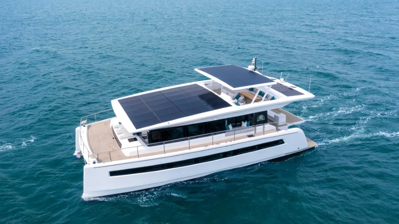 Large solar-panel arrays are integral to recharging banks of batteries on vessels like the Silent 62 three-deck power catamaran, one of the largest electric yachts on the water. The panels are designed across the top for maximum exposure to the sun. The catamaran design is also more efficient than a monohull, which has a lot more wetted surface, while giving owners much more interior volume, thanks to the large beam.