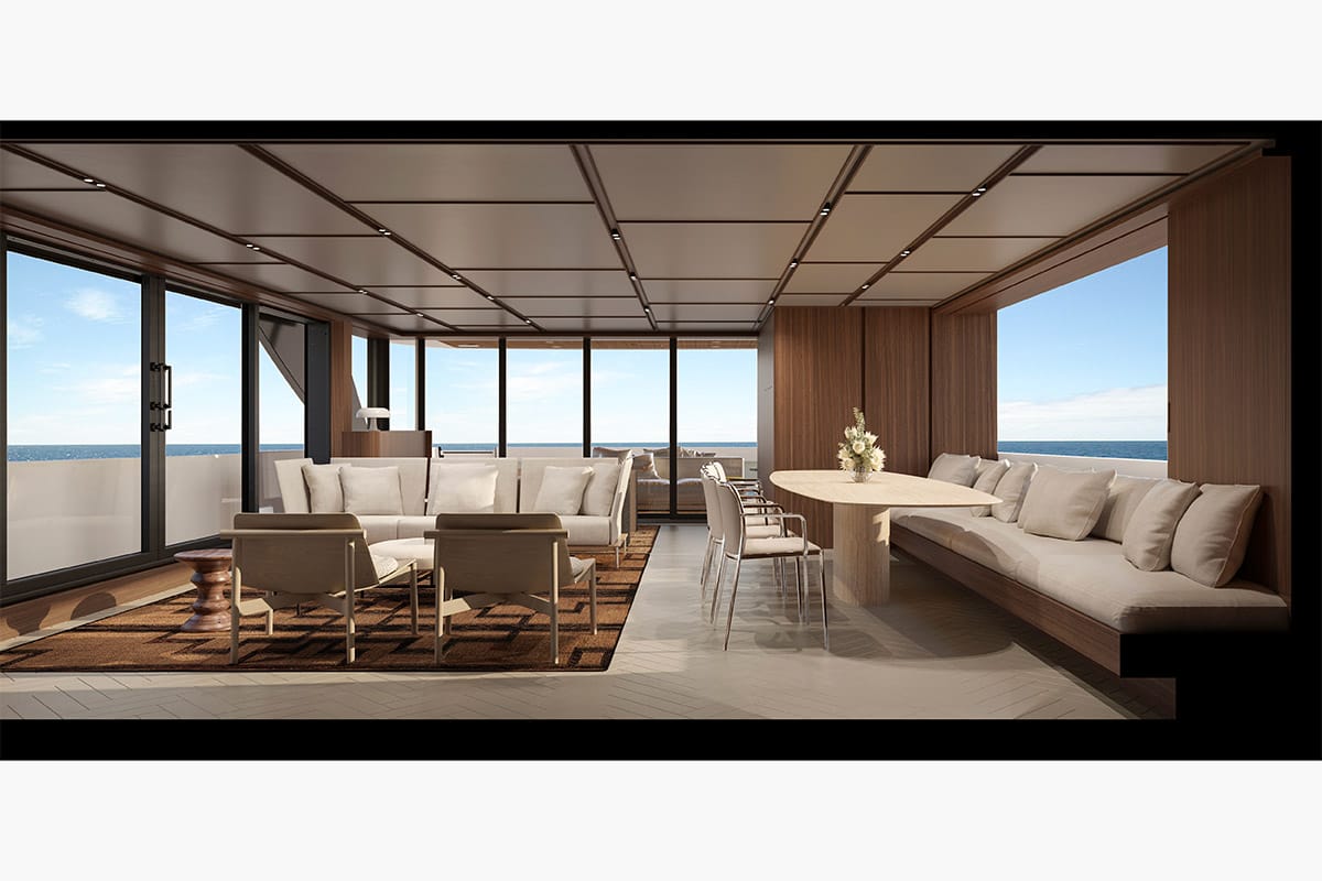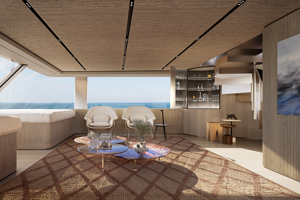 The SX120 is also a technological statement, becoming the first yacht worldwide to integrate Volvo Penta’s IPS Professional Platform, a pioneering propulsion system powered by four compact 1,000hp engines. This breakthrough dramatically reduces fuel consumption and emissions while freeing up valuable space on board, giving way to a spectacular 70 sq m beach area. It is further expandable via fold-down terraces, which also feature a retractable pool—an innovation that turns the stern into a floating resort perfect for even the most ambitious parties. In addition, owners of the superyacht stand to enjoy 360° panoramic views from the upper deck, while the flybridge introduces the ‘Smart Island’, a modular seating concept that transforms from a sunbathing area to an elegant dining lounge under the stars. “The SX120 represents the natural evolution of a range that has changed the way yachting is conceived,” said Tommaso Vincenzi, CEO of Sanlorenzo, in a statement. “It combines functionality, aesthetics, and sustainability into a single product.”