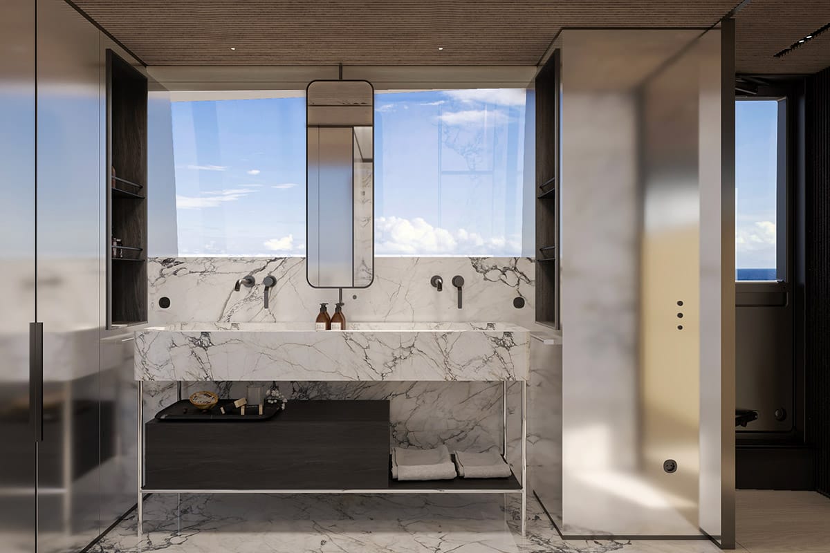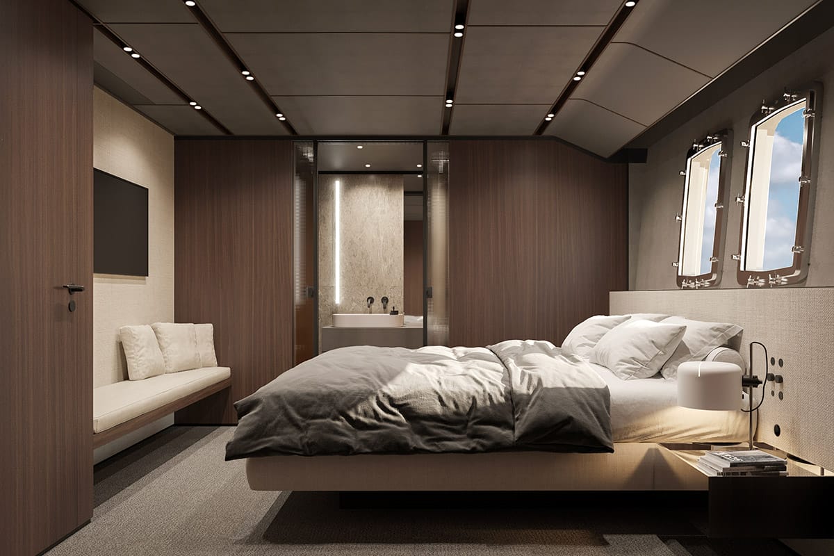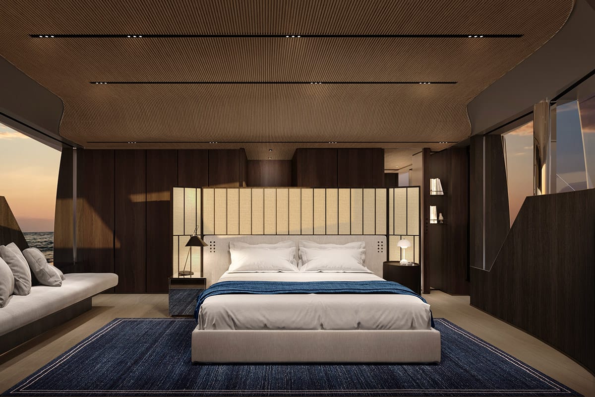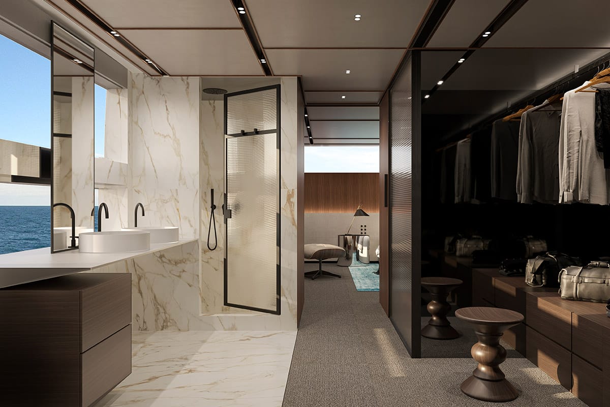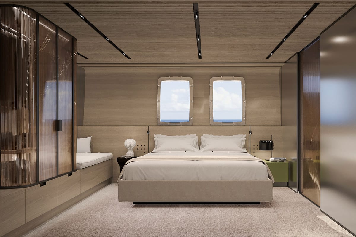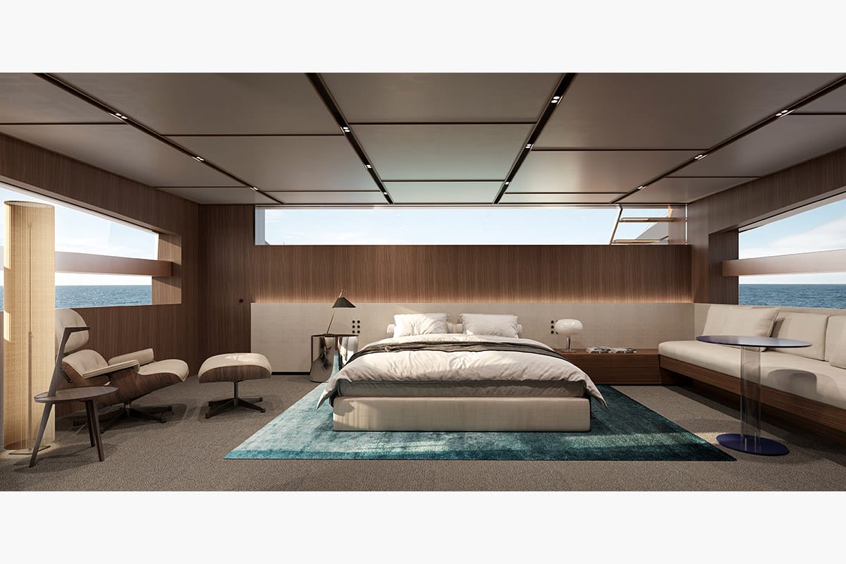 Looking inside, the SD132 demonstrates Sanlorenzo’s pioneering work in asymmetrical design, with offset walkways to maximise interior volumes and create a seamless flow through the yacht. Indeed, with a 55 sq m owner’s suite on the main deck, four guest cabins below, and vast-windowed salons to traverse through, accessibility and convenience are considered via meticulous design. The design incorporates a palette of natural woods and stone-like finishes, created in collaboration with Zuccon International Project, giving the yacht an atmosphere that is both architecturally sophisticated and warmly inviting.