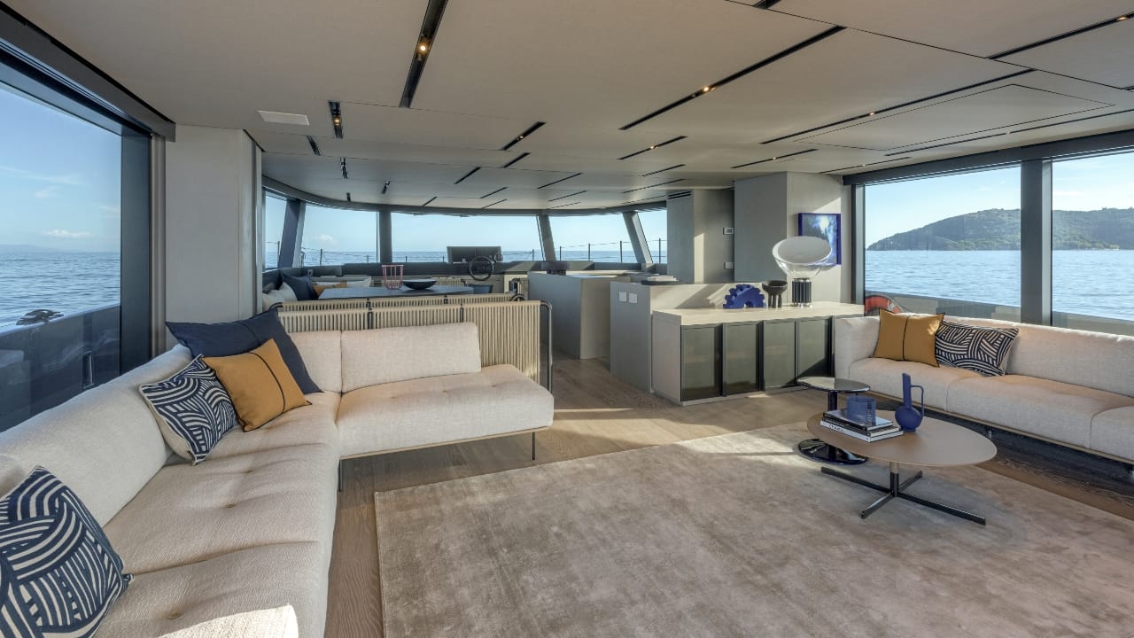 Refined touches of Italian craftsmanship can be seen throughout its magnificent interiors, which features a minimalist yet warm design of premium wood finishes such as teak and bespoke furniture like in the master suite (pictured above). Its luxurious full-beam accommodations include a master suite with a king-sized bed and walk-in wardrobe. Unlike traditional catamarans with longitudinal beds in the guest cabins, the BGM75 maintains independent waterlines, preserving optimal hydrodynamics while enhancing cabin space. In the four-cabin layout, there are also separate crew quarters for privacy, which includes a lounge area with monitoring systems—a more generous space than usual.