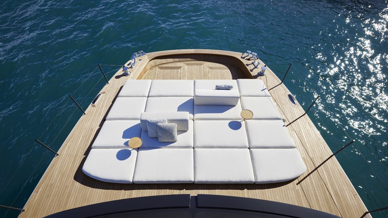 The BGM75 was built to glide effortlessly across the water, reaching a top speed of 22 knots with a smooth cruising pace of 20 knots. Built by optimising twin Volvo IPS engines, with 550bhp and 600bhp options, its system requires 50 per cent less power than mono hull vessels of the same volume and eliminates the need for a stern thruster. The choice to use carbon for the hull, as well as lightweight materials for all non-structural parts and furnishing components, has also contributed to a significant reduction in fuel consumption. To make an even more sustainable choice, 56 solar panels can also be installed on the deckhouse to produce 5kW of green energy.