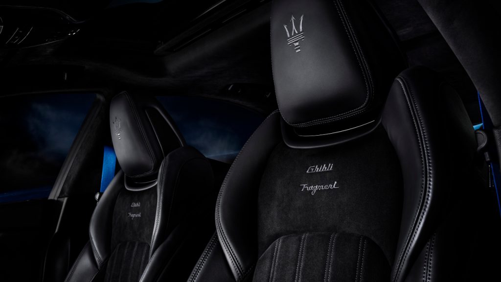 Inside, the uniformity of colour continues and sees black leather and Alcantara seats emblazoned with the Fragment name and Maserati trident. There’s also a special alphanumeric tag that runs underneath the triple side air ducts. It reads “M157110519FRG”; the first four characters reflect the Ghibli ID code, the following four reference the date of Fujiwara’s first meeting with Maserati (5 November 2019), and the last three are another tribute to Fragment.