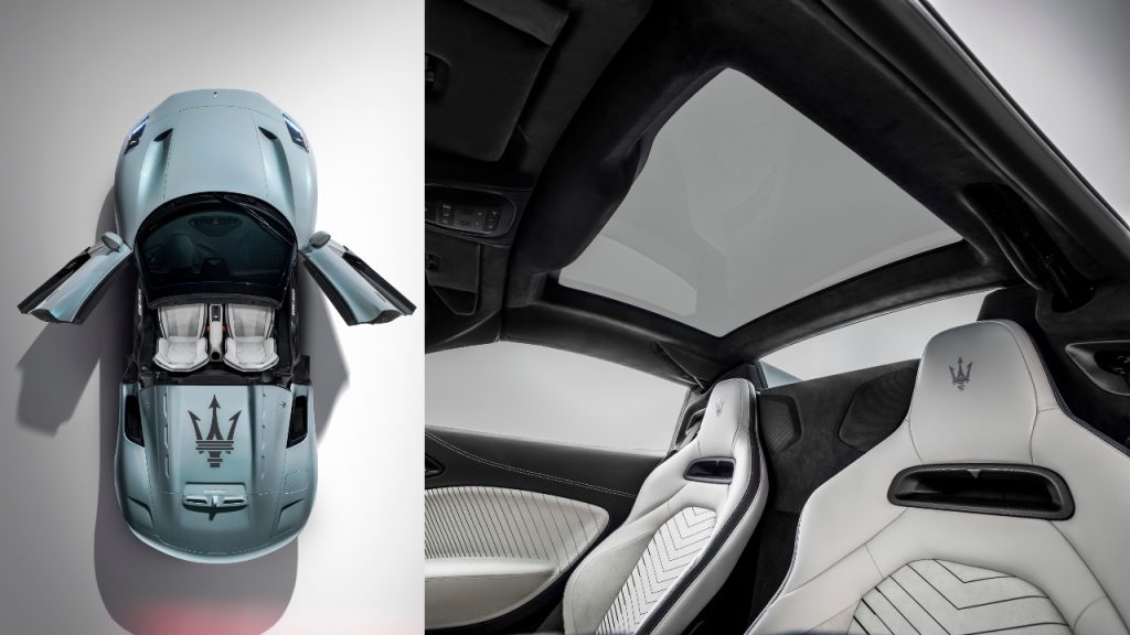 Like certain UK-based, carbon-bodied competitors, Maserati has incorporated an electrochromic “Smart Glass” window that promises to either block the sun or let in light at the touch of a button. However, unlike its peers from Surrey, Maserati’s system defaults to a fully opaque setting when power is not being fed to the system, creating a light-proof barrier as opposed to the competitor’s, which doesn’t fully block the solar rays. The Polymer-Dispersed Liquid Crystal folding roof adds a bit more complexity and weight compared to what a non-transparent panel would, helping bring the total weight gain to 143 pounds. But the performance figures remain essentially unchanged: zero to 62 mph in approximately 3 seconds flat, and a top speed in excess of 199 mph.