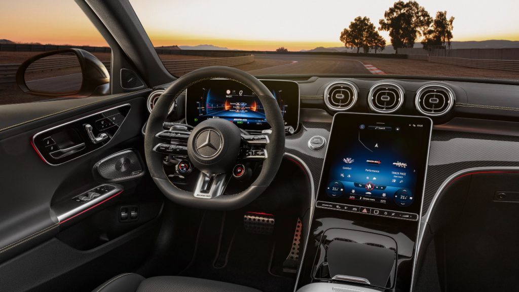 There’s a lot going on beneath the skin of the latest C63 AMG. Much of which flies in the face of the simpler days when Mercedes-AMG’s hopped-up sedan boasted a burbly V-8 that spun the rear wheels at the slightest provocation. Nowadays, handling is aided by torque vectoring and a standard rear-wheel-steer system, which seem like necessary workarounds since the new car is around 3 inches wider and longer than its predecessor. Crucially, packing all that hardware means it tips the scales at a considerable 4,654 pounds. The latest tech means that some of the old visceral touchpoints (like the sonorous exhaust note) are lost due to the inherent utility of the 2.0-litre four-cylinder engine. On a recent conference call, AMG Chief Technical Officer Jochen Hermann told Robb Report that the engine sounds will be enhanced through the speakers via a pressure sensor in the exhaust system.