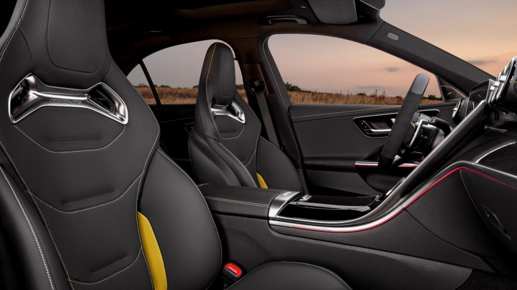 Though it’s technically classified as a plug-in hybrid, this fleet four-door derives its tech from the pinnacle of motorsports, the Mercedes-AMG Petronas Formula 1 racecar. One of the most direct trickle-downs from F1 can be found in the 6.1 kWh lithium ion round cell battery pack, which is essentially a scaled-down version of the unit found in Lewis Hamilton and George Russell’s daily office. The 400-volt hardware was developed in-house by AMG and incorporates all the goodies you’d expect in a state-of-the-art power unit, including a robust direct cooling system, lightweight construction from an aluminum crash structure, and a slew of secret ingredients the F1 competition would kill to know. In order to maintain handling balance, the 196-pound piece is positioned over the rear axle.