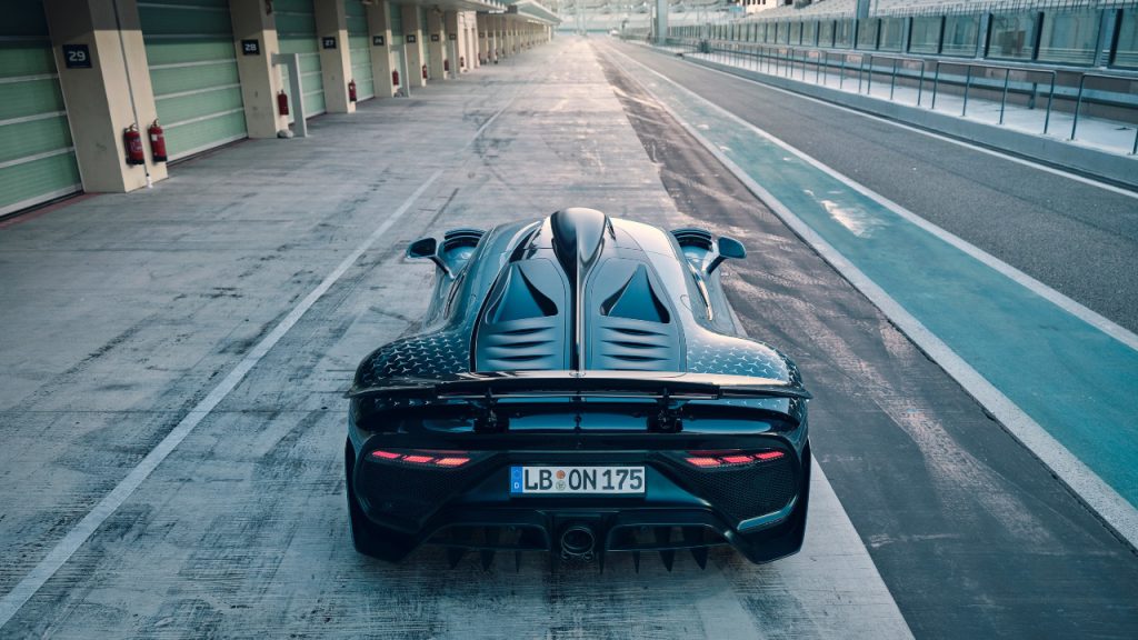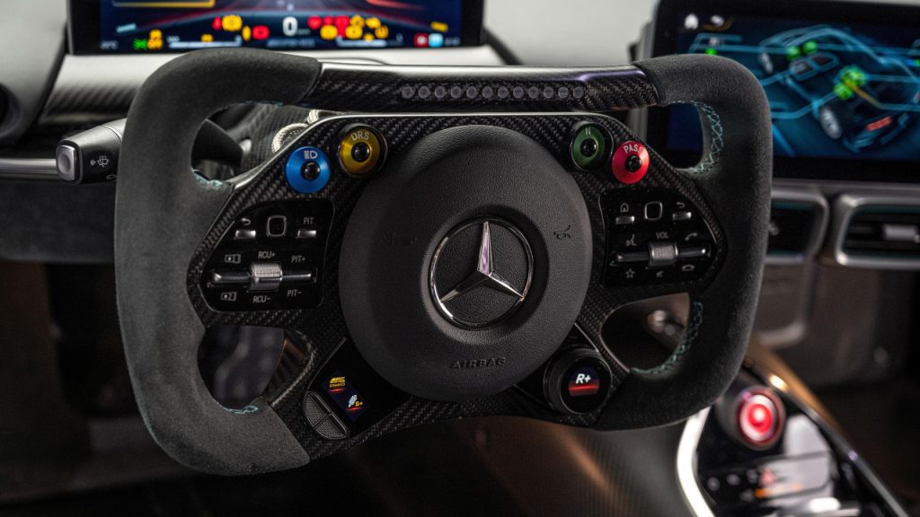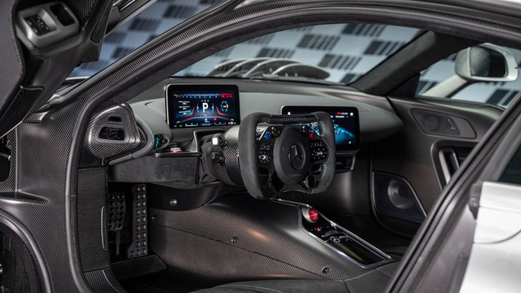 The One doesn’t look like a race car from the outside, but it does from the inside. The interior is stripped down, with almost none of the creature comforts you’d expect from AMG’s parent company. There’s room for just a driver and passenger, and everything has been done up in menacing matte black. There are two 10-inch displays, though. A digital instrument panel is positioned behind the Formula 1-style rectangular steering wheel, while an infotainment screen has been positioned in the centre of the spartan dashboard. You can use the latter to navigate or check out what’s behind you via the its rear-view camera. The steering wheel and pedal box are also adjustable so the driver can find a position that feels just right.