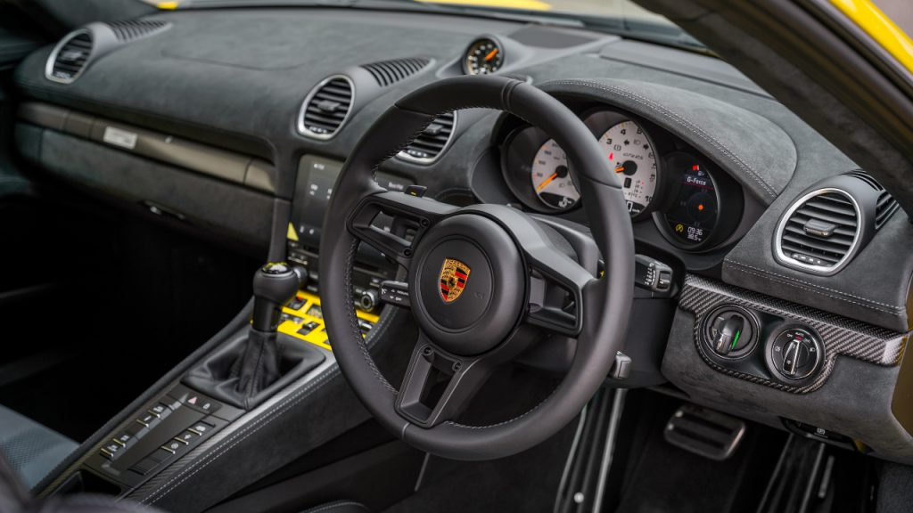 Its lightweight nature is derived from the use of carbon fibre-reinforced plastic in body components such as bonnet and front wings, alongside the paring down of creature comforts via thinner carpets, less insulation lightweight glass, and things such as fabric door pulls instead of handles and nets for storage compartments – every gram counts in a racing machine. Add in a new fixed rear wing, 25 per cent more downforce, and other chassis modifications, and you have something that goes around the Nurburgring more than 23 seconds faster than the standard GT4 – and only a handful of seconds behind the 911 GT3.