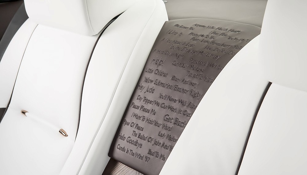 Rounding out the bespoke quartet of cars that premiered was an automotive homage to the man behind the Beatles, Sir George Martin. His son, Giles, helped design a Wraith that incorporates the 30 hit singles his late father was responsible for. These appear as a list embroidered at the back of the cabin’s interior. Further flourishes include the senior Martin’s signature on the headrests and, on the door flights, engraved lyrics from the Fab Four’s song “Yesterday” and Martin’s insightful saying, “The recording is not what one hears, but what one must make others hear.”