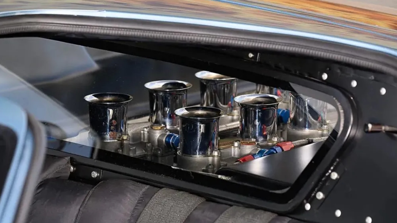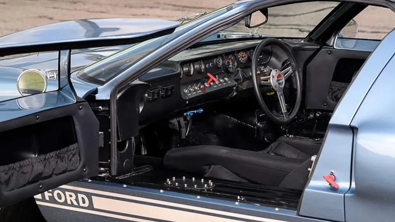Since then, the car has been restored to its original factory condition, meaning it’s again finished in Silver Blue with white Ford graphics. It still has all the details exclusive to road-spec GT40s, including carpet, fabric door pockets and wire wheels. In the engine bay, you’ll find a 4.7-liter V-8, which, while smaller than the mill found in the race car, can still churn out a highly respectable 380 hp and 312 ft-lbs of torque.