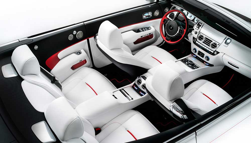 With not one, not two, but three different variations, the new Dawn line follows the Wraith Inspired by Fashion in providing a stark blank Andalucian white canvas. Where the Wraith sparingly used accents of green, red or purple on the exterior, Dawn Inspired by Fashion goes for a bold splash of colour. Specifically on the folding roof, with the three flavours being Mugello Red, Cobalt Blue or Mandarin. The same colours are replicated inside, as vibrant accents on the headrests and seat piping against the perfectly white hue.