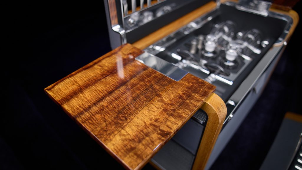 According to Rolls-Royce, the process of tracking down and negotiating to buy a suitable specimen of prized Koa took almost three years. The end result, however, is spectacular. The rich, warm, honey-coloured Koa veneer flows across the Phantom’s dashboard, centre console, rear picnic tables and doors. It’s even used in a matching picnic hamper that, alone, took more than 500 hours to create.