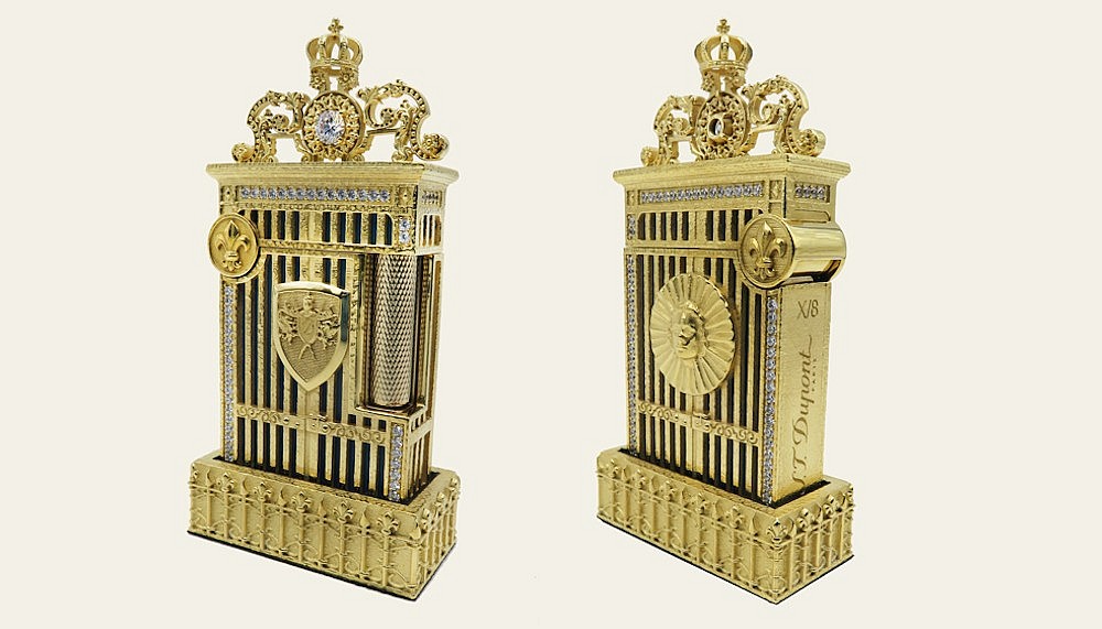 S. T. Dupont — known for its ultra-luxurious leather goods, writing instruments, and smoking accessories — teamed its artisans with those of another Paris-based firm, 2 Saints, renowned for its exquisitely detailed bronze castings. Together they created a replica of the Montgolfière balloon, which, by use of either an electronic switch or a remote control, slowly rises mechanically from its base to reveal a 24-karat-gold DuPont L2 lighter inset with 110 pavé diamonds that total 3.85 carats. Only available as part of the Montgolfière balloon presentation, this one-of-a-kind lighter’s design was inspired by the Palace of Versailles.