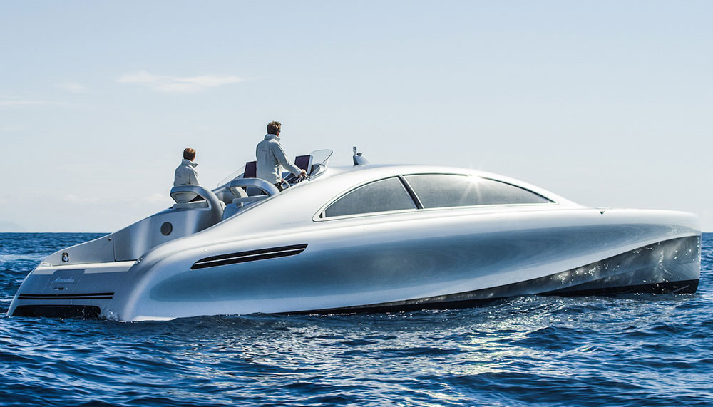 Its nickname isn’t accidental; referring to collaborator Silver Arrows Marine, it also describes the optics of the boat – a mercurial streak across a deep blue sea that is inspired by the Mercedes-Benz F015 and Concept IAA vehicles. Holding up to 10 passengers, the interior is a plush playground of nubuck leather and eucalyptus wood, with retractable side windows and a raised windscreen that allow a panoramic repose. The configuration of each yacht will be unique to each eventual owner, with options including a bathroom unit, air-conditioning, an audio system, a wine cellar and an ice-maker.