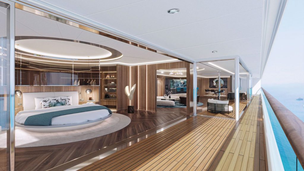 The world’s first “yacht liner” is finally ready for her close-up. The gigantic 728-foot Somnio, which is something of a cross between a cruise ship and a superyacht, was unveiled to the public earlier this year without any images of the interior. Recently, the first, official renders of the lavish living quarters were revealed, and, boy, it was worth the wait.