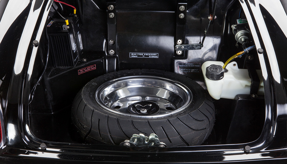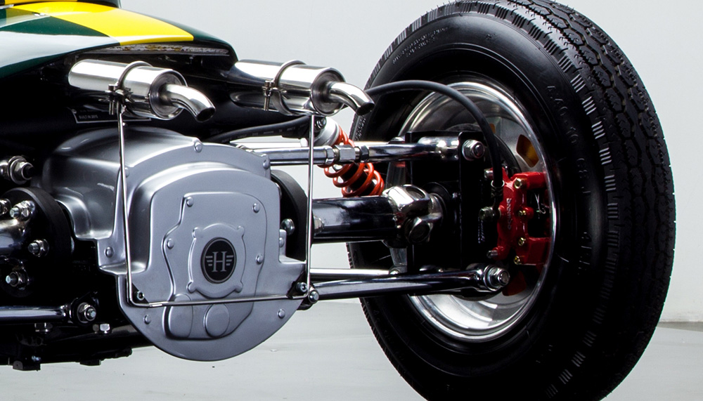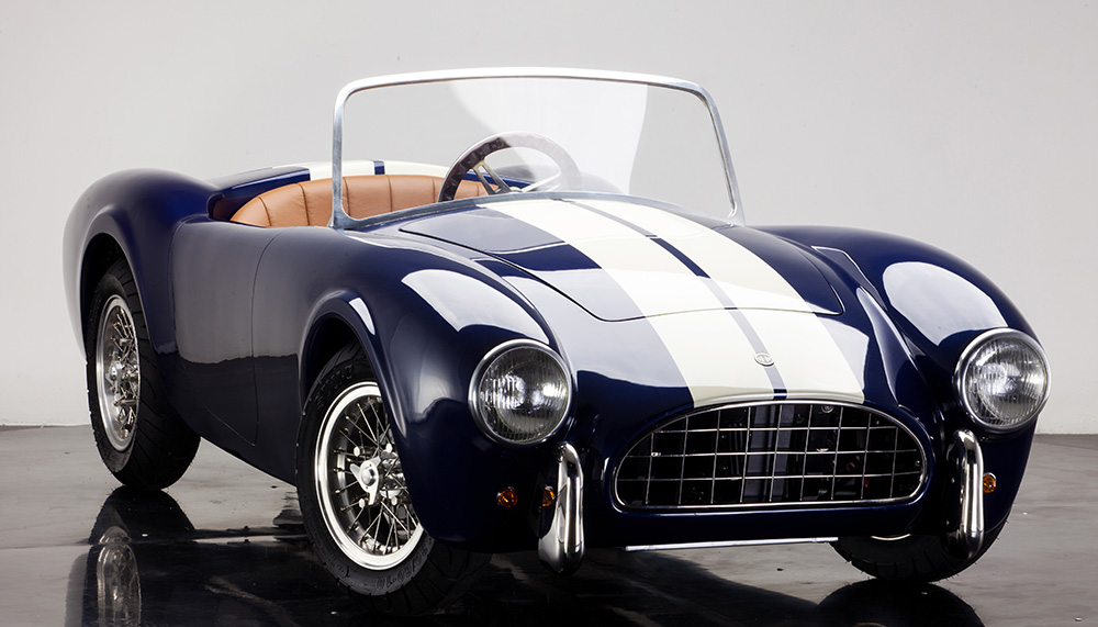 The design of each Junior Car was inspired by an iconic classic car, harkening back to the glory days of the racing-inspired automobiles of the 50s, 60s and 70s – a vintage Formula 1 racecar here and a swinging icon there. Each car is equipped with an independent wishbone suspension up front and in back, adjustable gas shock absorbers on all four heels, vented disk brakes with Brembo calipers front and rear, and a working horn, lights and turn indicators. The front-mounted, air-cooled, 125cc four-stroke engine sends powers to the rear wheels through a 3-speed semiautomatic transmission.