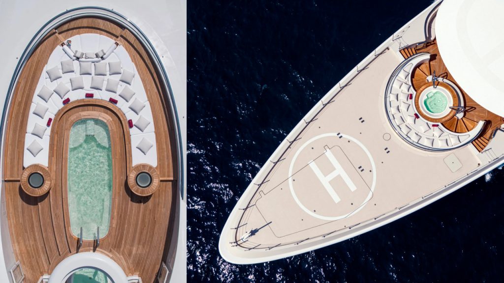 For additional sunning and dipping, Valerie’s vast forward deck, with a touch-and-go helipad big enough to land a Eurocopter EC130 or Bell 407, has another pool and a semi-circle of sunpads. The deck can also double as a golf driving range.
