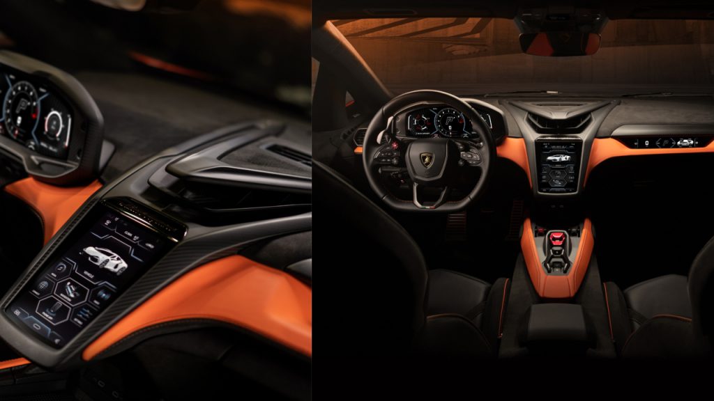 The cabin is also brand-new. The Revuelto’s interiors are decidedly spacious, featuring more headroom and a driver’s cockpit that has an appropriate fighter jet-style vibe. The dashboard also features three different digital displays, such as a 12.3-inch digital gauge cluster and a 8.4-inch infotainment screen for the driver, as well as a 9.1-inch display for the passenger. The driver will also be able to use the squared-off steering wheel and infotainment system to select between 13 different driving modes, including Recharge, Hybrid, and Performance. Lamborghini wants to make sure you get the most out of its hybrid powertrain.
