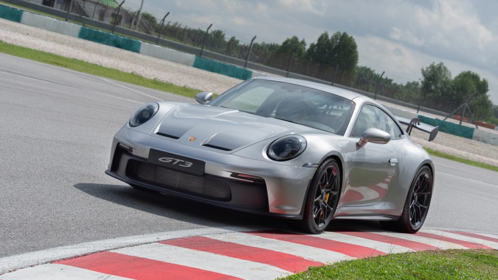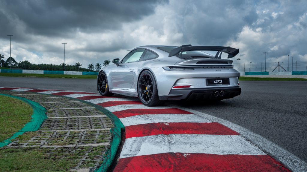 With AI-backed operating systems, autonomous driving, and the inexorable approach of electrification, the Porsche 911 GT3 (from about RM1.8 million) is a refreshing, old-school blast, one that arrived in Malaysia at – where else – Sepang International Circuit in conjunction with the fortnight-long Porsche World Roadshow 2021. The sound of its naturally aspirated 4.0-litre six-cylinder boxer engine, revving at up to 9,000rpm on the asphalt, would have announced it long before visitors would have sighted its streamlined profile.