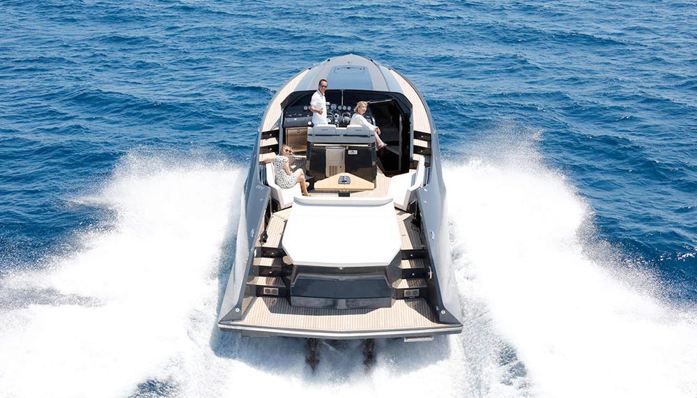 Despite the handsome profile, Harry Miesbauer, who has collaborated with Frauscher on three hulls since 2013, gave the Demon a serious offshore running surface. Its deep-V hull is mated to a twin-step design aft to increase performance, while the 1414’s hull is fuel efficient on long cruises. Cool-looking carbon-fibre blades along the side conceal the air intakes that actually cool the engines. The stern-drive configuration makes it feel like being at the helm of a much smaller boat, while the optional bow thrusters and joystick control make the Demon behave in docking situations. Optional features include a teak gangway that extends electrically, making access straightforward, and a tender garage beneath the aft sunbed, further proving that the 1414 Demon is a serious offshore boat.