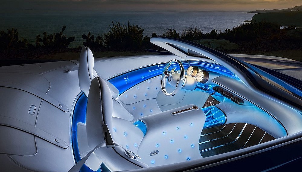 The illuminated cabin is grounded with a yachting-inspired floor constructed of open-pore wood and inlaid aluminum. Surrounding the occupants is a continuous trim that integrates all display elements and touch-sensitive controls. The overarching theme of flushness is countered by what Mercedes designers call “hyperanalogue” elements like twin gauges with real needles.