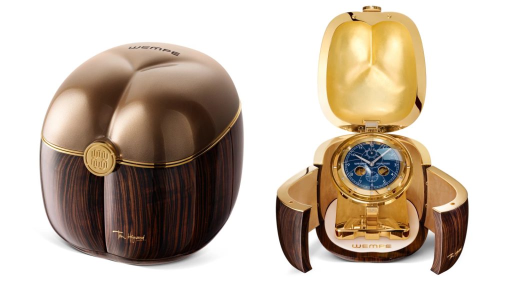 The Wempe Marine Chronometer Coco de Mer by Tim Heywood is inspired by the soft organic lines of Heywood’s designs. The case is inlaid with exotic Coco de Mer nut, known for its ability to travel long distances at sea unscathed, making it a perfect symbol for marine chronometry. The triple-doored case of the Coco de Mer was varnished and polished, with a lid coated with bronze. The inside is finished in gold leaf.