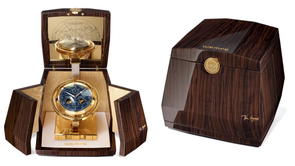 The Wempe Marine Chronometer Cube by Tim Heywood has a dark brown case, which can be opened using three folding doors. The core is created by laser sintering at Metrica, a specialist in custom yacht fittings. The case was given 16 coats of varnish and was then hand polished to give it a deep glow and make it seaworthy. It includes a gold-plated time zone map under the lid.