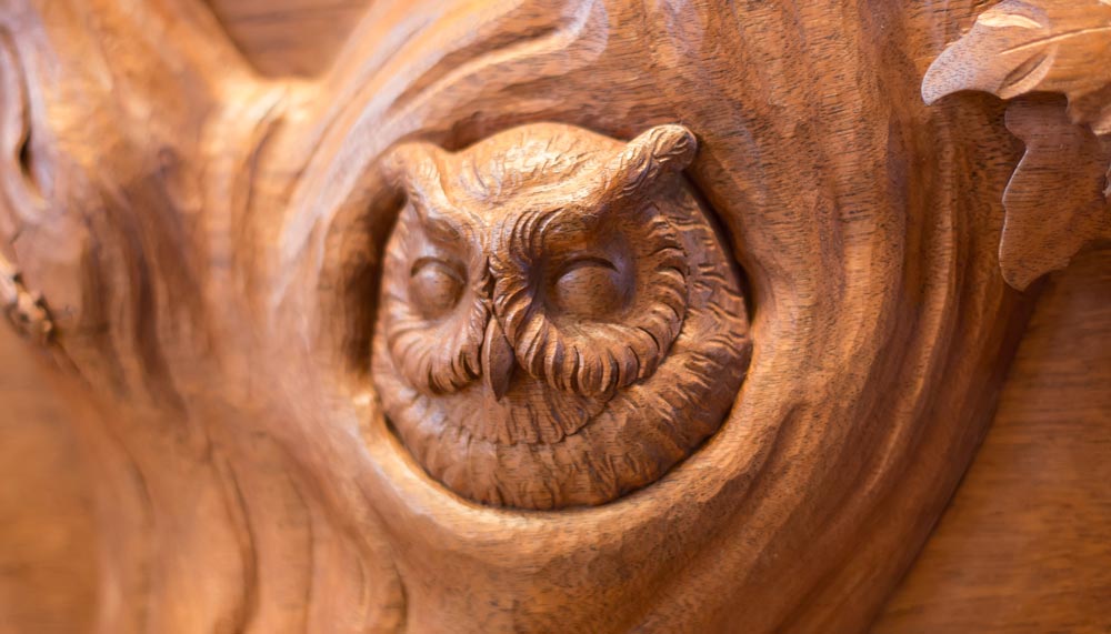 There’s over 50 of them, from owls and squirrels to badgers, frogs and the like. Insects, too, aren’t left out with 100 of them, from beetles to dragonflies, plus another 100 populating architraves, balustrades and bookshelves. At the foot of the tree is a lectern complete with a bespoke leather-bound book giving a brief naturalist’s introduction to all the wildlife featured. Ultimately this sculpture, constructed in Brazilian mahogany over marine plywood, is a grand gesture of grandfatherly affection, as an educational tool for his young grandchildren. Aptly enough, the US-based client’s superyacht (sufficiently super enough that this grand carving cost just one per cent of the overall budget) is called Sea Owl.