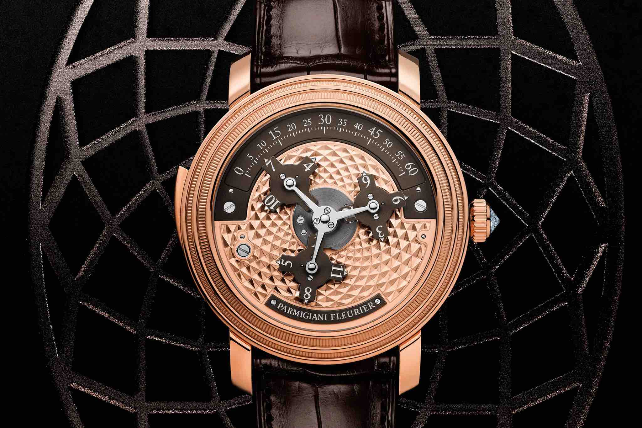The Toric Capitole features an 18-carat rose-gold dial handmade by a master engraver on a brown Hermes alligator strap with a diamond crown.