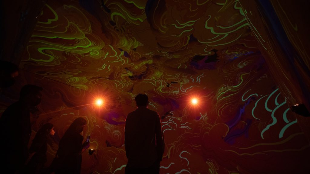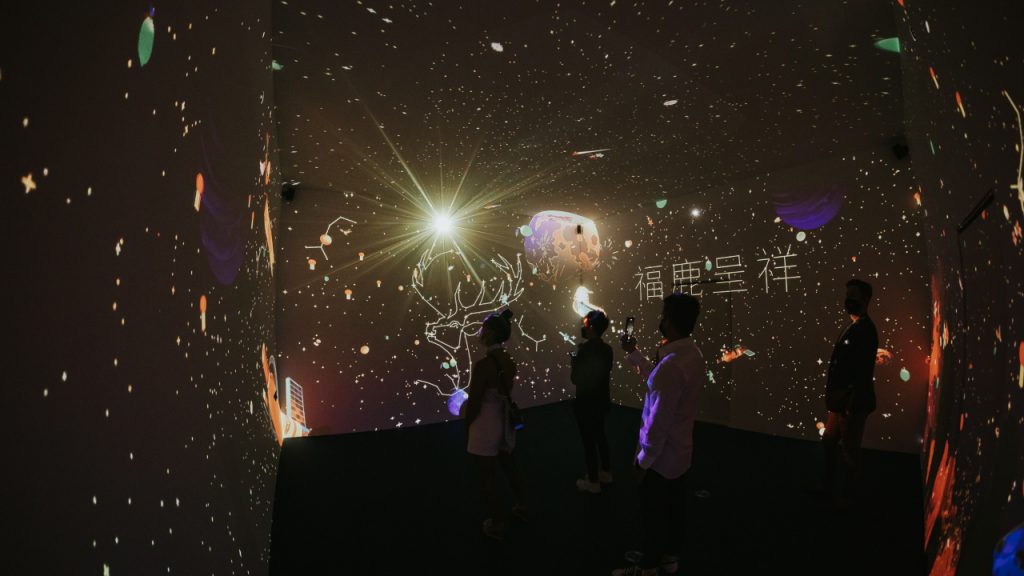 Visually, The Glenfiddich Cosmic Voyage takes its cue from the works of Rlon Wang, the Shenzen-based illustrator who is collaborating with the Speyside distillery for the third year. Its main exhibit is a 360-degree sensory experience: a dazzling animation that covers the room’s four walls and ceiling, one that chases the Glenfiddich stag across starry landscapes adorned with symbols of Chinese New Year celebration.