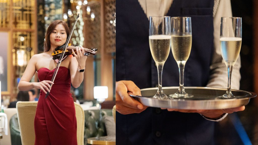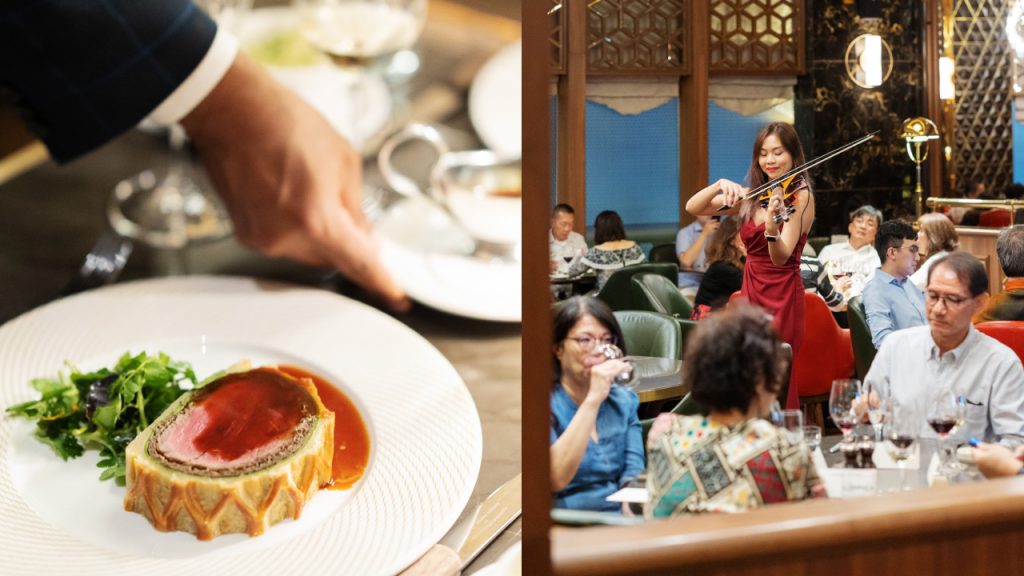 Guests were also serenaded with a violinist and took turns to enjoy the lush arrangement of bespoke florist Zahuohang, located at the entrance of Gordon Ramsay Bar & Grill. Guests luxuriated at the chic restaurant’s opulent interiors, which recreate the London Mayfair vibe through dark, wooden herringbone floors, brass details, as well as portraits by British photographers Terry O’Neil and Arthur Steel. Dry-aged meat fridges and a central, statement-making wine cellar added to the sense of theatre and occasion on the night.
