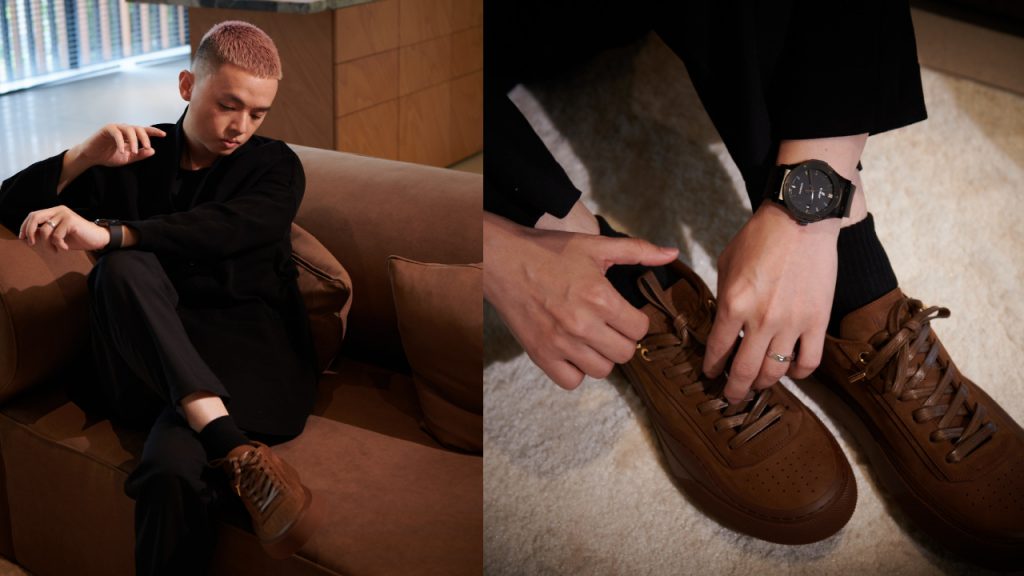 Huan Ooi wears his own attire and the basketball-inspired HNY Low sneakers, designed by Kim Jones and produced specially for this collaboration, in cognac-brown leather.