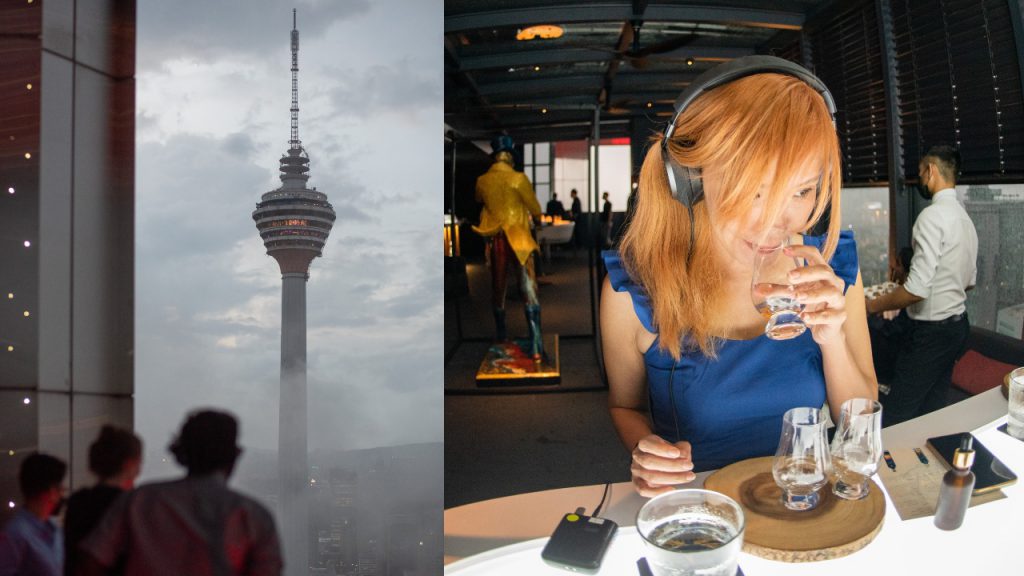 Thus, on a rainy, mist-filled evening in the heart of downtown Kuala Lumpur, guests of Robb Report Malaysia and Johnnie Walker Blue Label arrived at EQ, and headed for Sky51’s Blue – the hotel’s rooftop lounge and bar. Here, they would witness the unveiling of a singular Striding Man – the emblem of Johnnie Walker, as interpreted by the creative mind of Mark Lee. Just before the unveiling, guests partook in welcome highball cocktails as well as a mentoring session by Johnnie Walker’s whisky ambassador Chong Wai Keong who guided them on a sensorial traipse through three Johnnie Walker Blue Label expressions; the classic Blue Label, the Ghost and Rare Glenury Royal, and Ghost and Rare Pittyvaich. The latter two are, as their name dictates, a blend whisky stocks derived from distilleries which are now lost to the present world.