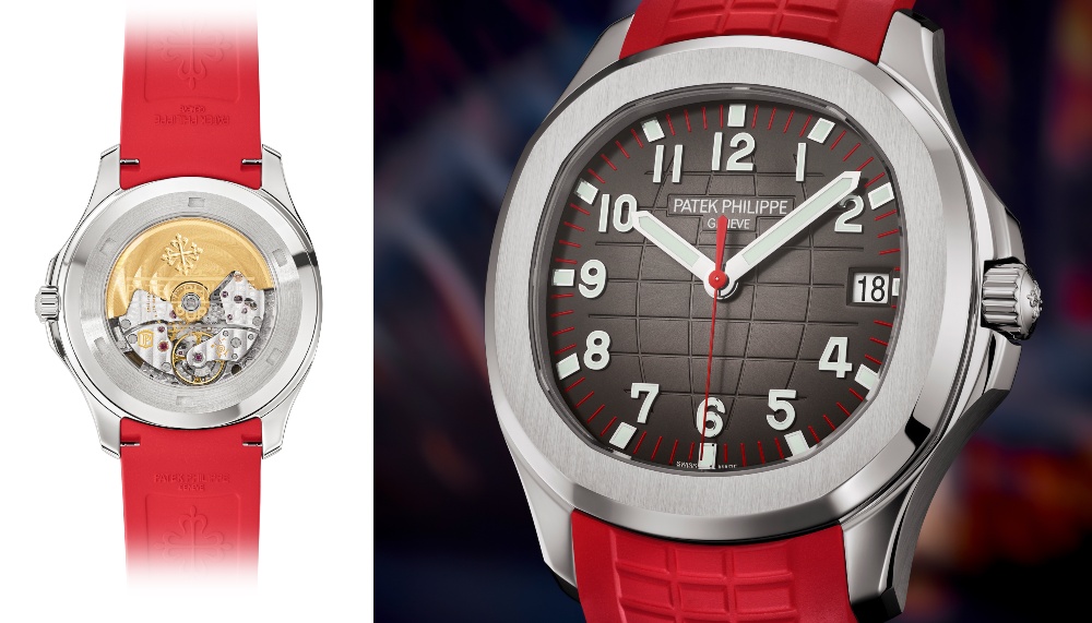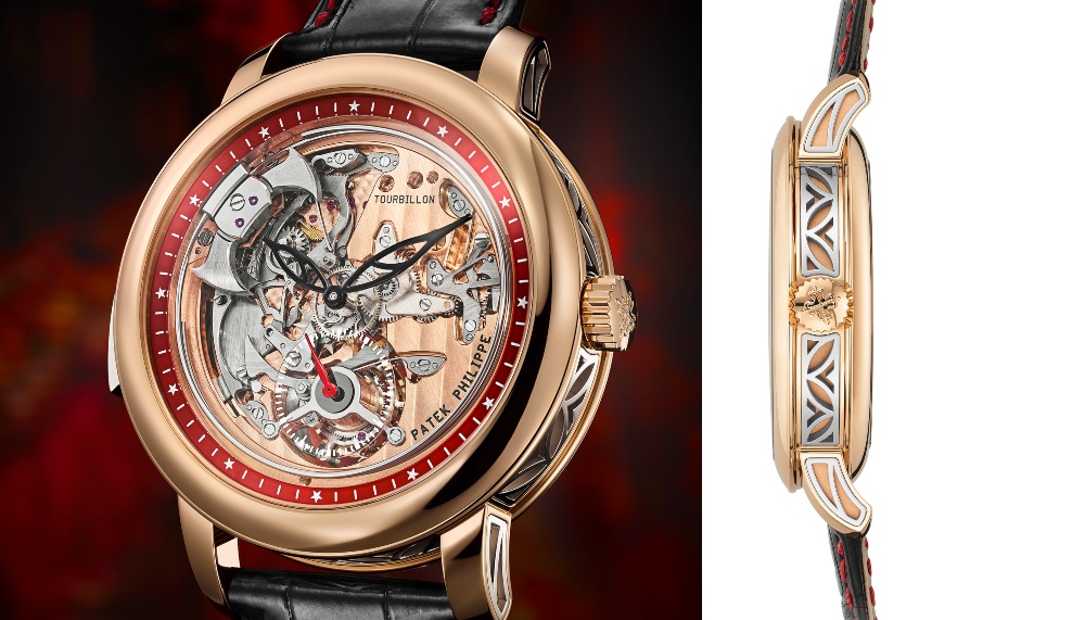 The highlight is the reference 5303 Minute Repeater Tourbillon. Limited to just 12 pieces, this new grand complication is a daring timepiece that lacks a dial, exposing the steel and rose-gold parts of the striking mechanism within. The gongs have been moved to the dial side, to better appreciate their action, and have been attached directly to the caseband for better sound quality. The case is rose gold with white gold decorative elements, while the chapter ring is lacquered in red and has white star markers that recall the flag of Singapore.