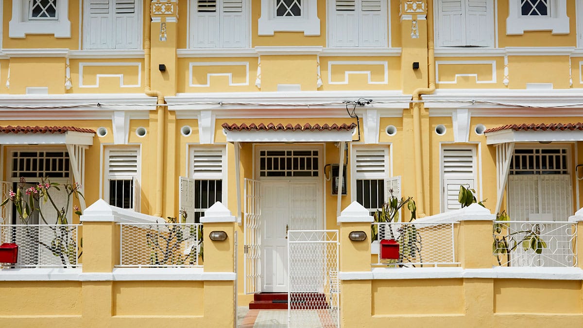 Colin Yap, general manager of George Town Heritage Hotels, helped Ong to execute Ong’s vision. “All five houses have been given a fresh coat of paint, Mini Copper, a breathable paint for heritage homes. It was one of the colours originally painted on the building, and I was told it was also the colour of the Church of the Assumption,” Yap says. A warm, buttery yellow is accompanied by a white trim that highlights architectural elements such as window frames, pillars, and decorative mouldings, creating a bright contrast against the yellow façade.