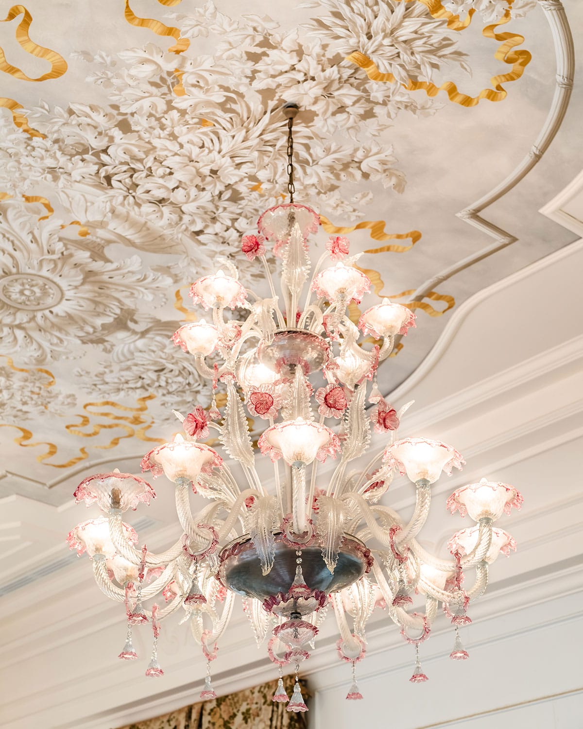 The space is adorned with a Minotti sofa, a Bösendorfer piano played by Mikiko, and a sculptural chandelier of glass leaves suspended on fine wires to evoke the sensation of foliage falling gently, bringing the outdoors in. The sole parallel with Villa Primavera 1 lies in the presence of customised Murano chandeliers.
