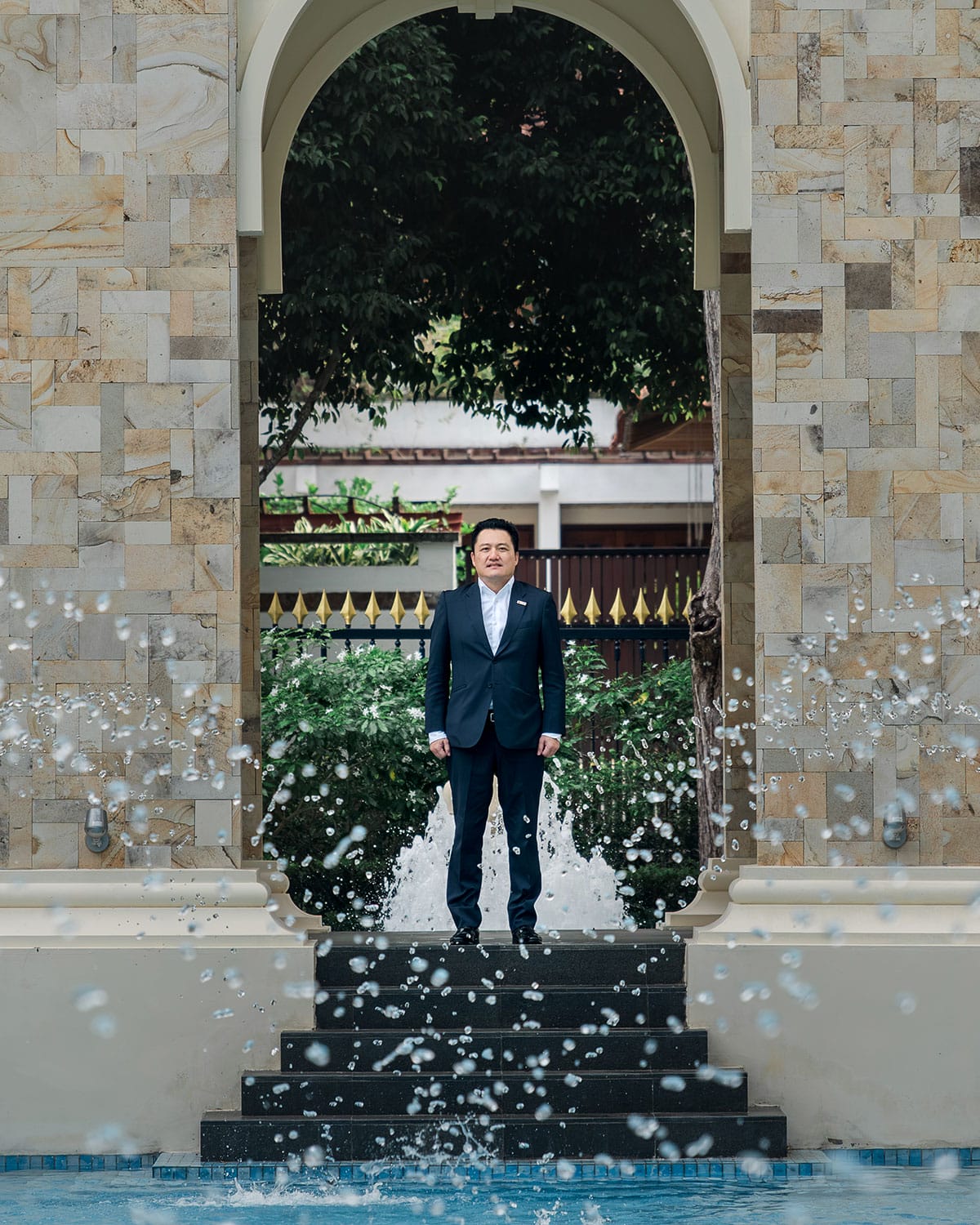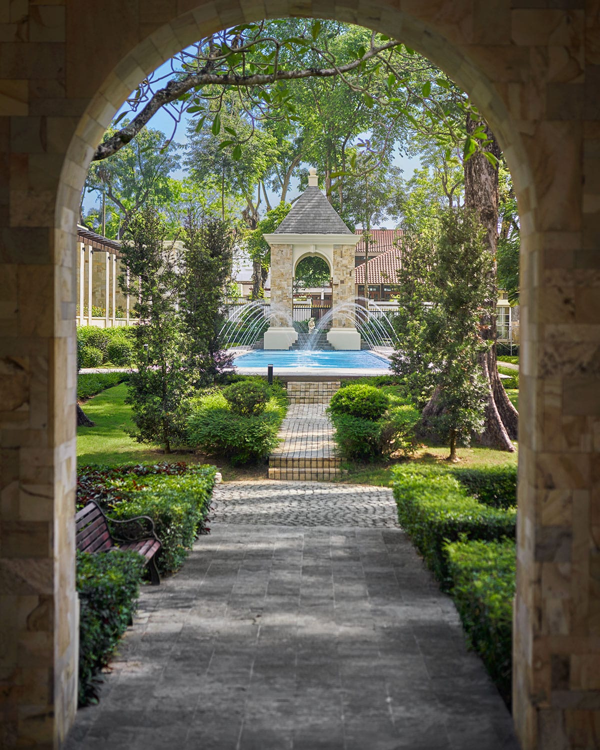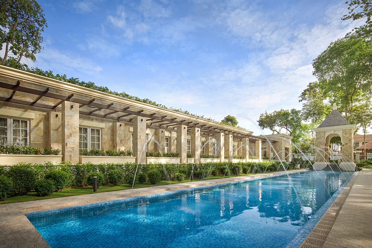 Nearly three decades later, a new chapter was added to Villa Primavera. In June 2022, a single-storey annexe was conceptualised, preserving the stateliness and symmetry of Spanish and Italian architectural influences of the main building, while integrating contemporary interiors. A separate entrance gate, with a large porch laid out with cobblestones, greets guests. Here, a pavilion with mouldings and arches has also been carved out of palimanan stone and placed on the walls of the gazebo leading to the swimming pool. “This area, including the jet fountains, statues, and birdbaths, was inspired by the Alhambra Palace’s numerous canals and water features,” Tan Sri Konishi says.