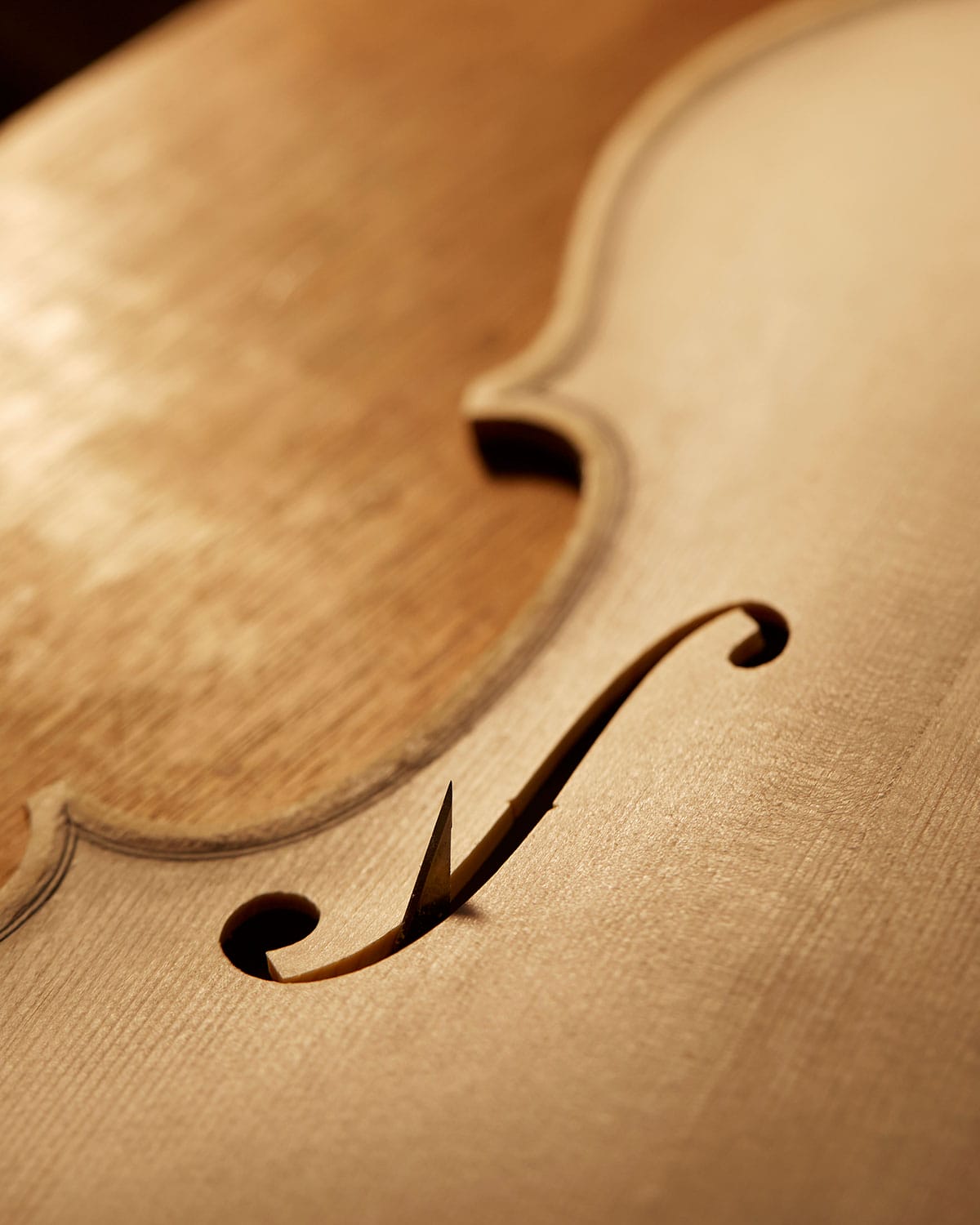 4. The distinctive f-holes are cut on either side of the bridge using a sharp knife. These delicate openings are not merely decorative—they play a critical role in sound projection and tonal quality, allowing the body to vibrate freely and produce a balanced tone.