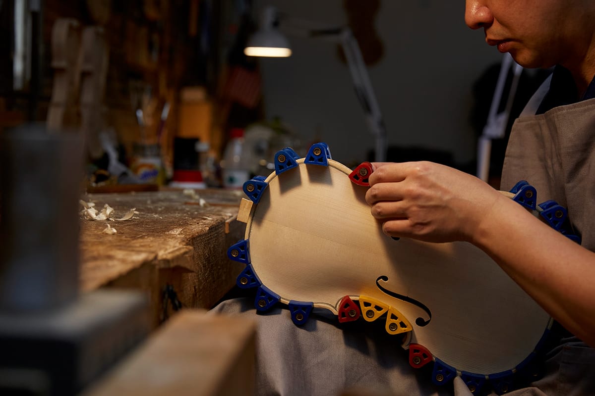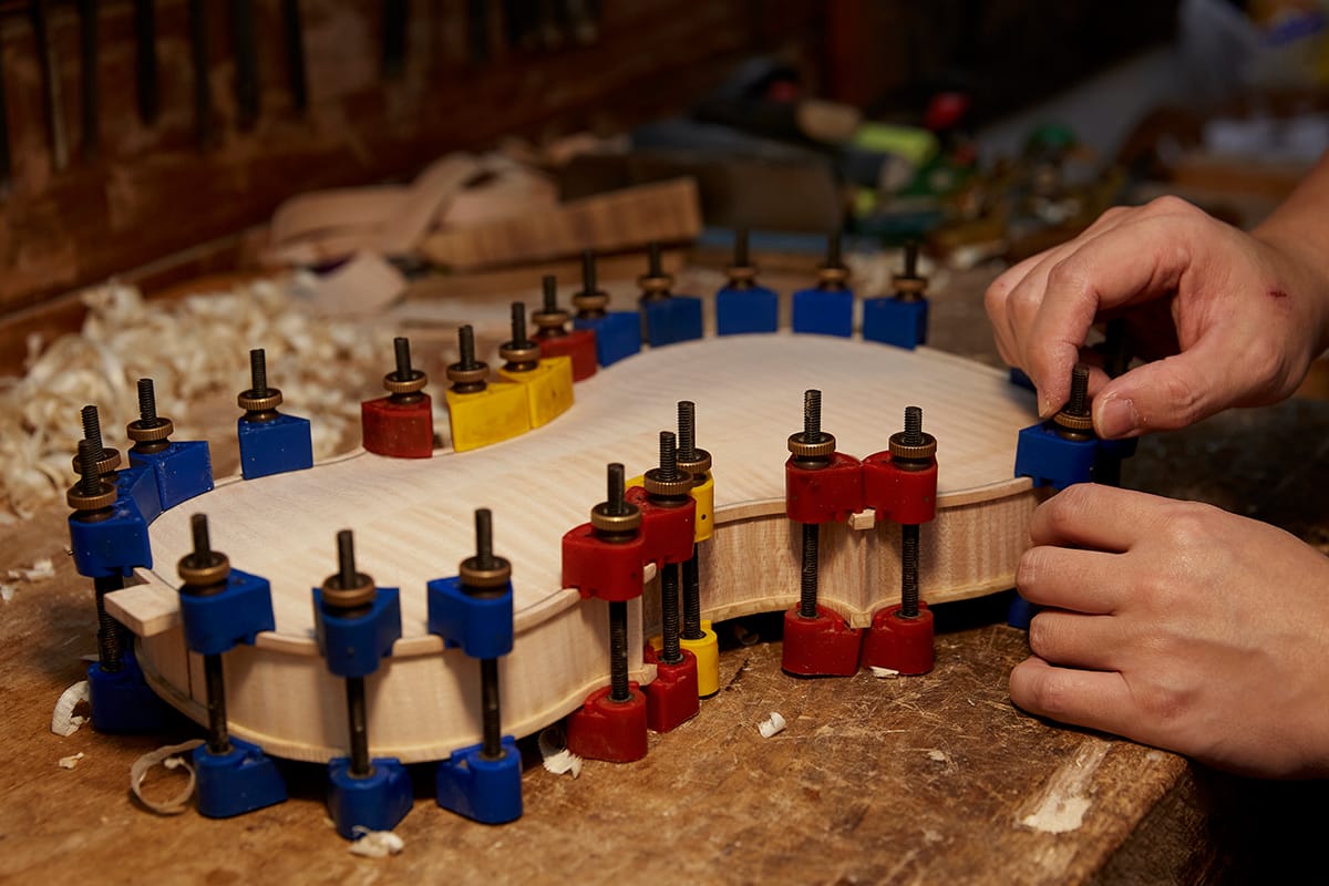 6. The top and back plates are fitted and glued to the rib structure, forming the violin’s hollow resonating chamber. Tan uses organic glue made from cow bone, then clamps the plates securely all around to ensure a strong bond.