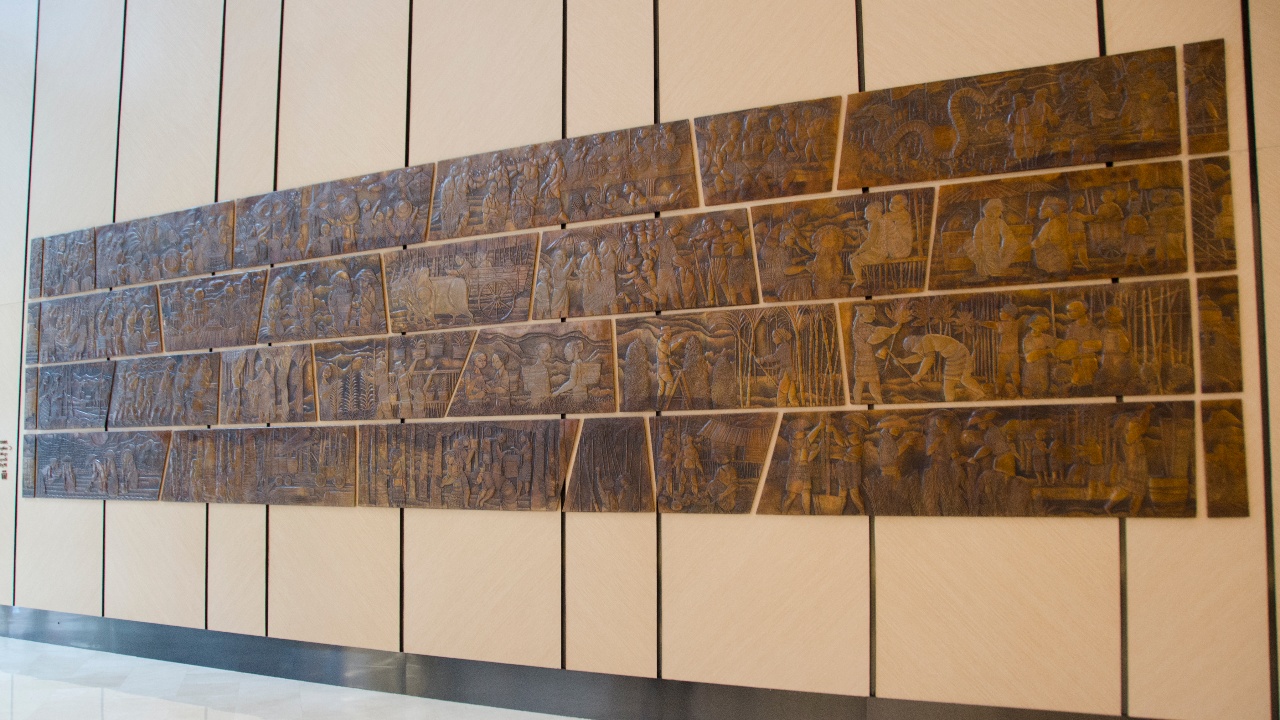 Embarking on this artistic journey at the age of 30, Yan poured his passion into immortalising the simplicity of Malaysia’s villages. “After obtaining approval for my initial sketches, I set out on a journey through various kampungs, hoping to capture the essence of Malaysia’s countryside life,” says the artist, who is affectionately known around EQ Kuala Lumpur as Mr. Yan. His three-month artistic endeavour comprised eight-hour workdays, bringing forth not just a portrayal of pastoral scenes but also an evocative tapestry of traditional pastimes such as wayang kulit (shadow puppetry) and Kelantanese kite-flying. As the copper tooling artwork took shape, it evolved beyond a snapshot of village life. Yan blended images of agriculture practices such as ploughing, planting, harvesting, threshing and winnowing––all symbolic of industrialisation.