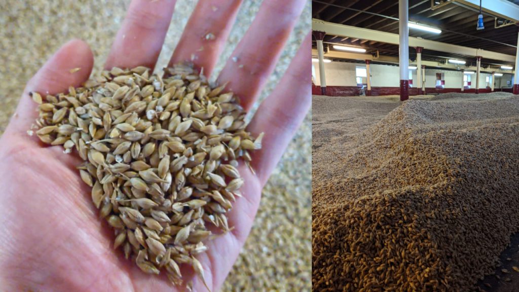 Now, the barley is ready to grow, and is laid out on the malting floor proper, which is on the ground level. Here, sections of barley are carefully laid out by hand on the bare concrete, with defined bevelled edges suggesting the pride taken in the work. At this stage, the barley is drying out, absorbing oxygen, and about to generate a root – and developing the starchy substances inside necessary for proper fermentation. The process generates heat, and several times a day the maltmen need to stir up the barley to let some of the heat escape.
