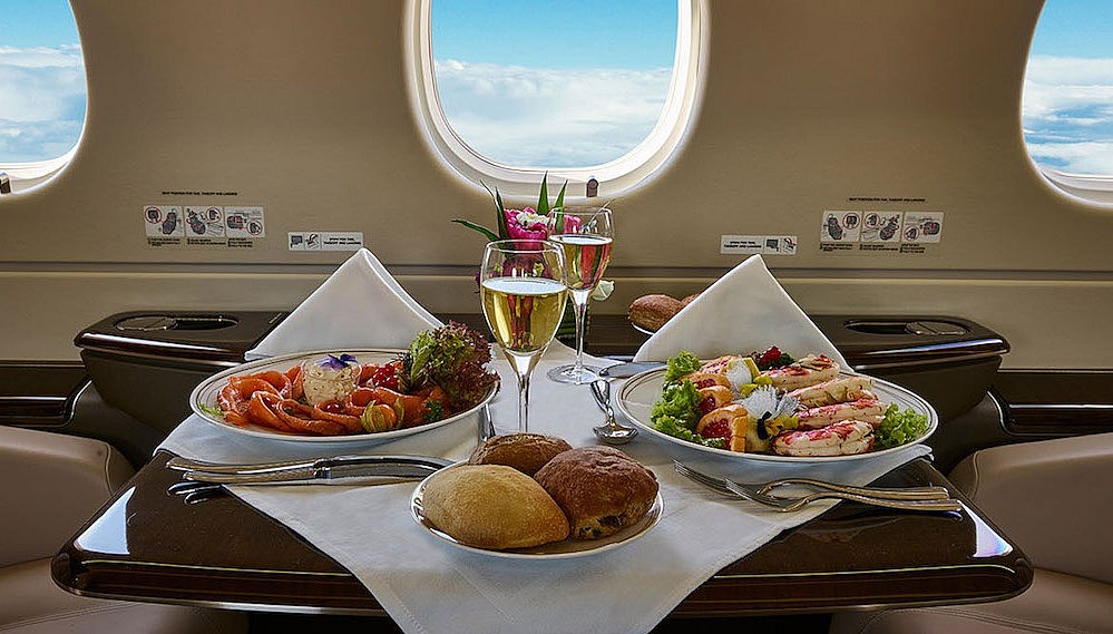 Certain foods — not necessarily special ones — also may be better suited to consuming when you’re on the ground. Pizza is one such food. “We absolutely don’t recommend it,” says Roberts. “You cook it, and then you have to chill it, so you’ve essentially ruined it from the beginning.” He explains how Food and Drug Administration regulations require that after an in-flight caterer cooks the food in one of its kitchens, it must chill it to 5.5 degrees Celsius or colder before shipping it to the fixed base operator (FBO) where the jet will be taking off. The food then has to be reheated on the plane, which may have only a microwave oven or a galley oven that heats to less than 150 degrees Celsius.