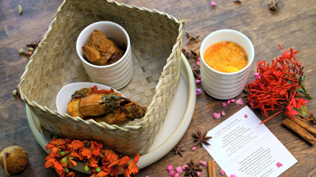 Diners first sharpened their palates with a tamarind-infused welcome cocktail before moving onto a crisp glass of Moët & Chandon Ice Impérial champagne. This was accompanied by a plump medjool date and a ball of yellow glutinous rice topped with sambal nyior – a Kedahan farmers’ breakfast comprising coconut, chilli, and dried shrimp, capable of delivering a spicy energy boost. Taking the edge off the heat, a refreshing Shichiken Yamanokasumi sparkling saké was served with a crunchy kerabu umbut kelapa salad, presented appealingly in a halved coconut shell.