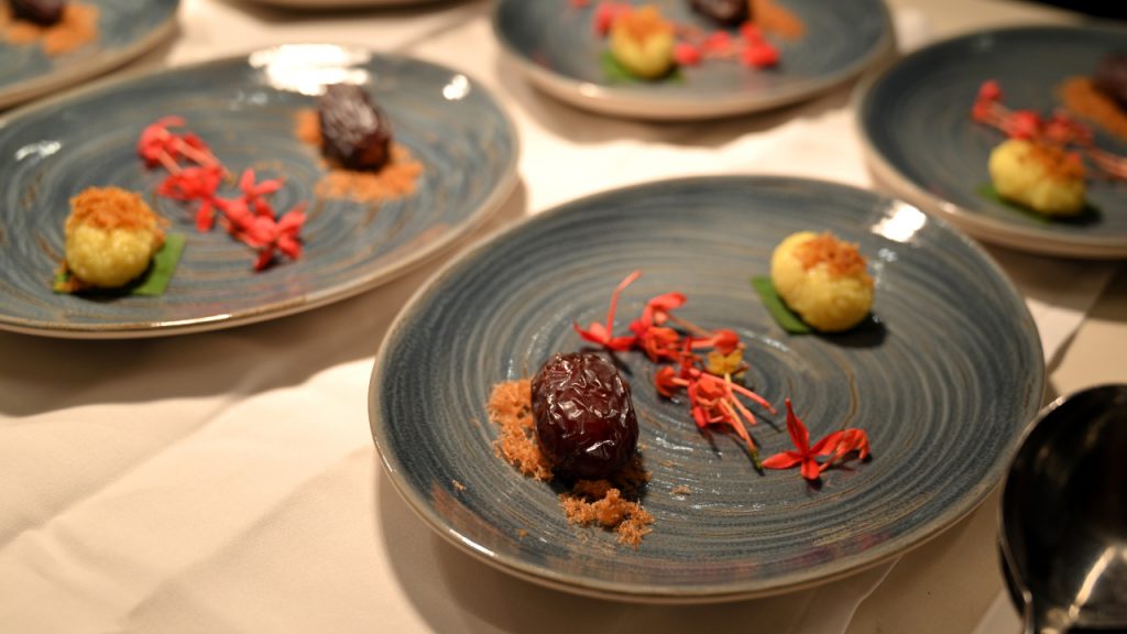 Underlining his quest to unearth rare dishes from northern Malaysia throughout his menu, Chef Azli Ahmad served two desserts already in danger of being overlooked. Gedung chak – a glutinous rice cake of Acehnese origin, cooked in a nipah palm leaf – and ubi kelempong, a Ramadan specialty belonging to the Thai jitra community of Kedah, consisting of young tapioca cooked slowly in sugarcane water. A sweet porridge of pengat pisang raja (made with sago, palm sugar, coconut milk, and ‘the king of bananas’) completed the trio of desserts, with a fruit-heavy 2015 Offley Porto Late Bottled Vintage mirroring their notes of caramel and palm sugar.