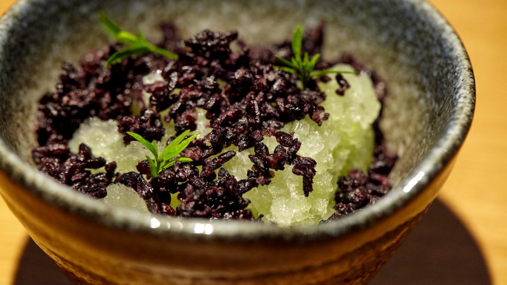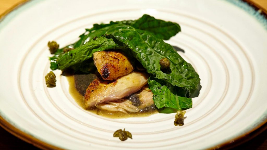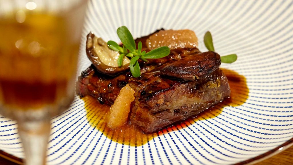 But it’s the next three courses that really drive home the message of just how superbly talented Timmermans is: first, a piece of steamed Scottish cod blanketed in a silky, sensual mentaiko emulsion, kombu butter, and a sheet of laver. A pear – burnt, blackened, and blended – becomes the gritty accompaniment to a confited quail leg, draped with forest-green dinosaur kale and sprinkled with lightly fried capers for crunch. Wagyu flank from Queensland’s Darling Downs, marinated in kōji for 12 hours, acquires burnt caramel aromas and a sensational tenderness while retaining the cut’s characteristic bite, making it a joy to eat with tamari brown butter sauce and purslane.
