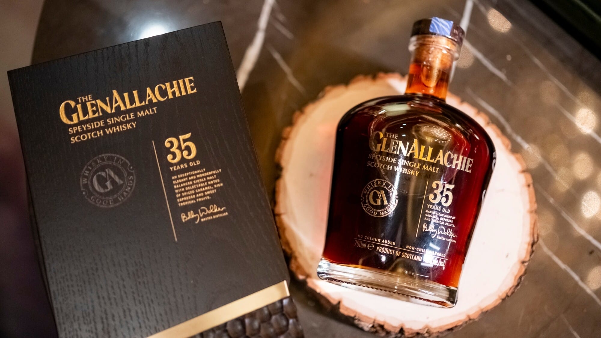 The GlenAllachie 35 Year Old is redolent with notes of spiced caramel, espresso, and sweet tropical fruits.