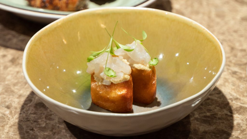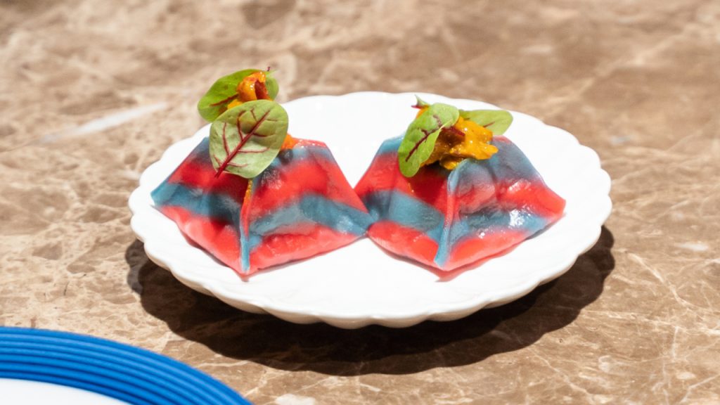 These were the best seats in the house to watch the first course assembled, a quartet of snacks served in a silver tray playfully lined with newspaper: a cracker dolloped with nutmeg milk puree, aged mackerel bottarga and a medley of ulam; the dewy crunch of a jicama “cup” to contrast the tangy filling of fermented red dates blended with anchovies and peanuts; glutinous rice cake with well-marinated ikan kembong curled around a mound of dabai paste; and whole grain pancake with roasted bread fruit elevated with the slight heat of chili.