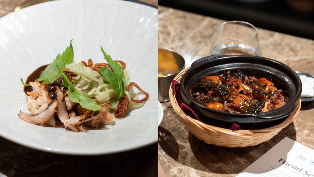 The flavours and textures were wide-ranging and complementary—rich and indulgent, herbaceous, lightly fatty, then punchy and spicy. Under the guidance of the crew in this interactive dining experience, guests were whisked through a meal that was both fun and educational. Local ingredients were unconventionally treated throughout. Tilapia was aged for seven days and served with sour fruits in an essence of chicken fat and scallops. Carrots were lacto-fermented for piquancy and mixed with root vegetables in a sea bream broth. Stingray was slow-cooked into a flavourful collagen emulsion to thicken a ginger and squid ink curry, to be twirled with herb noodles. River eel cooked à la unagi and finished on charcoal, served on claypot heirloom rice braised with lamb fat and a béarnaise sauce on the side.