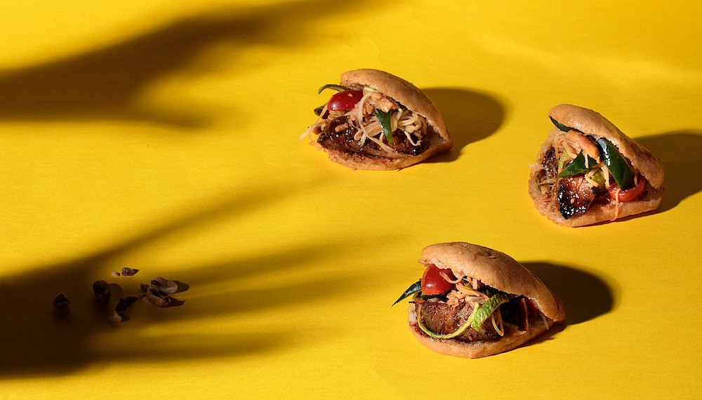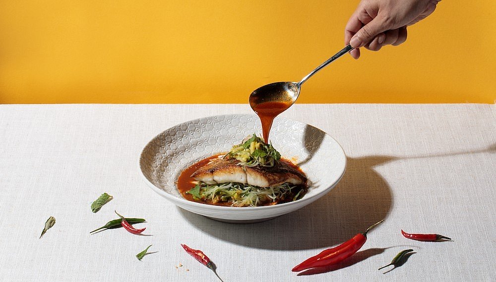 After a gin & tonic (unusual in the addition of pink peppercorns and guava, imaginatively presented in a Chinese takeaway box), a pickle board kicks the dining portion off. Crunchy, piquant and inventive, it wakes the palette up. Particularly the white fungus flavoured with passionfruit. A fiery Thai fruit and vegetable salad reminds us that this is no watered-down cuisine, while the Everyday Yee Sang (with seaweed and mackerel) ensures prosperity every evening. Mr Chew’s interpretation of various street foods are probably the most successful things on the menu. The Nori Taco is a beautiful amalgamation of salmon sushi and Mexican tacos, while the deep-fried catfish buns are worth second, third and fourth orders – the fish is roasted char siew style, and the som tam is tartly crunchy.