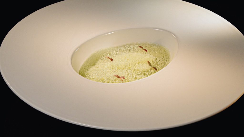 Mangrove wood charcoal and Japanese binchotan supply clean, smoke-free heat to his delicate dishes, paired with Hennessy X.O cognac. Take the plump Hokkaido scallop ringed by tiny shimeji mushroom heads, plated like a fairy circle and magical in its surprisingly intense flavour. Or the witty This is Not a Soup, in which a thickened vegetable broth that glorifies the prickle of Sichuan pepper is poured over meaty slices of Portobello mushrooms.